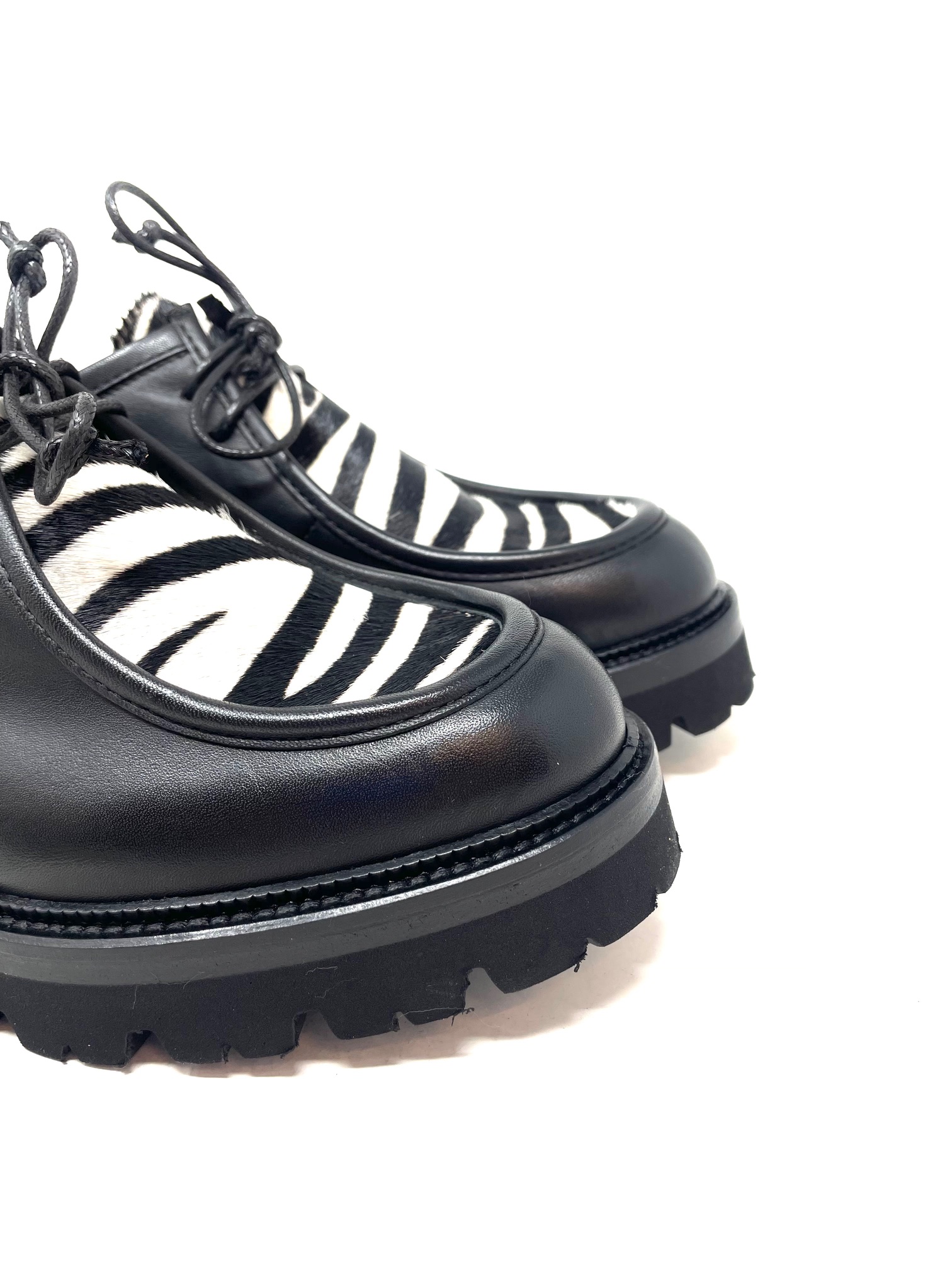 Esplora l'audacia della scarpa ingegnere in pelle nera con dettagli in cavallino zebrato.