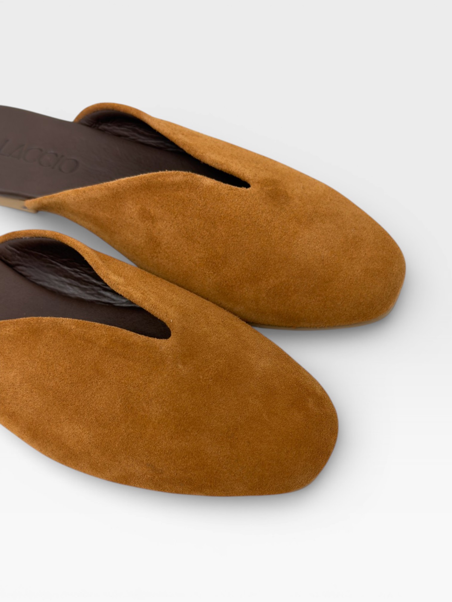 Queste scarpe da donna in stile sabot combinano semplicità e raffinatezza. Realizzate in morbido suede color cuoio, presentano una silhouette pulita con punta affusolata e scollo a V che slancia la linea del piede. Il design slip-on e la suola piatta le rendono perfette come ciabatte eleganti per l'uso quotidiano, ideali per look minimal e naturali.