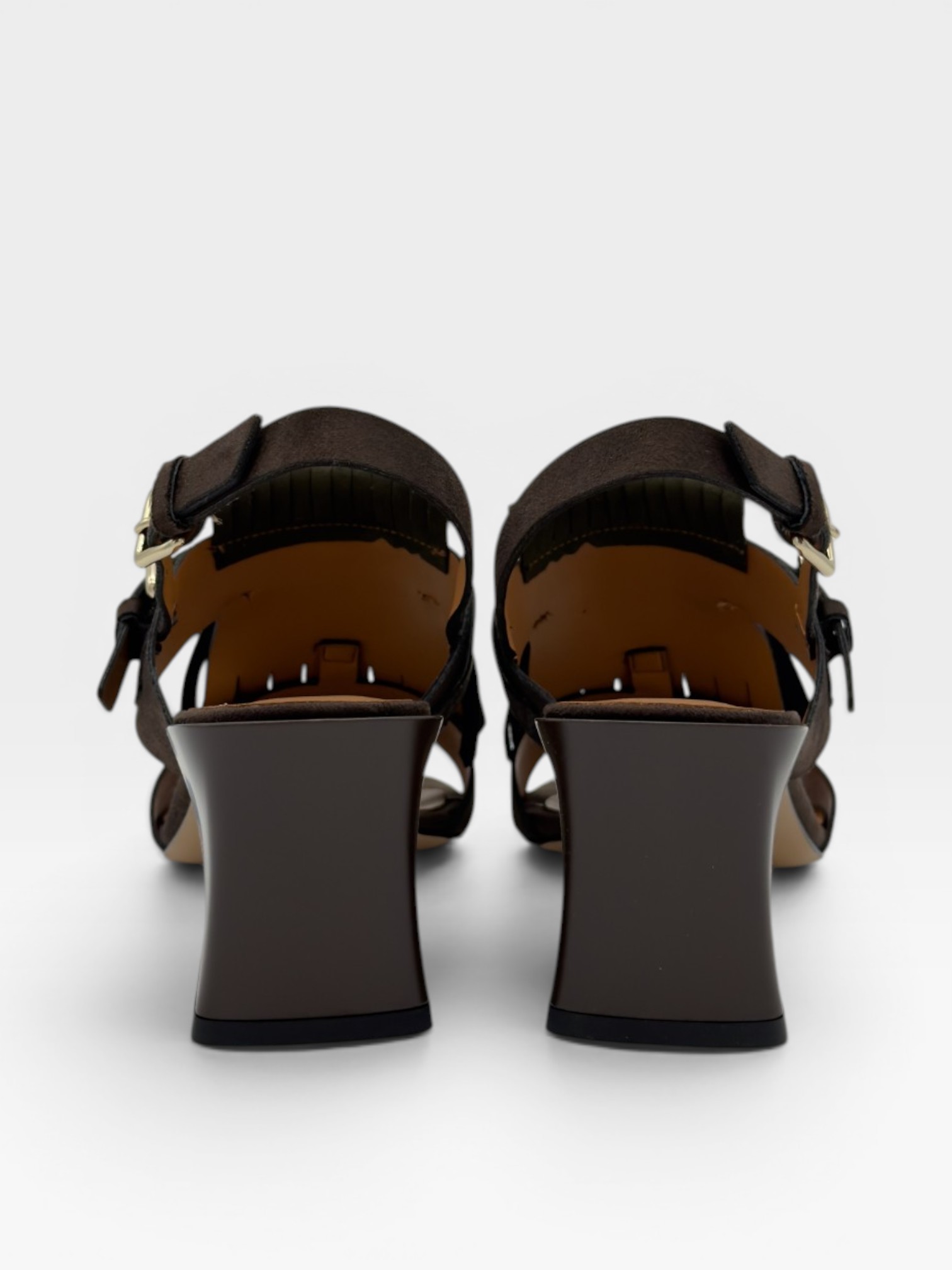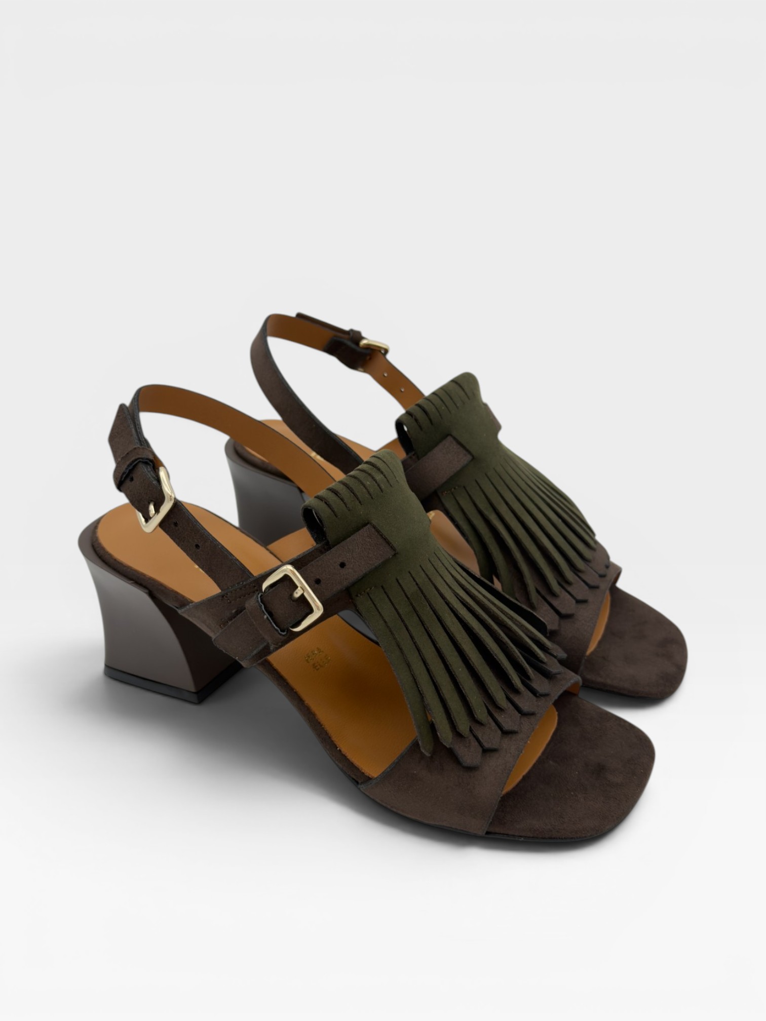 al contrasto tra verde e marrone. Il cinturino regolabile con fibbia e il tacco medio donano