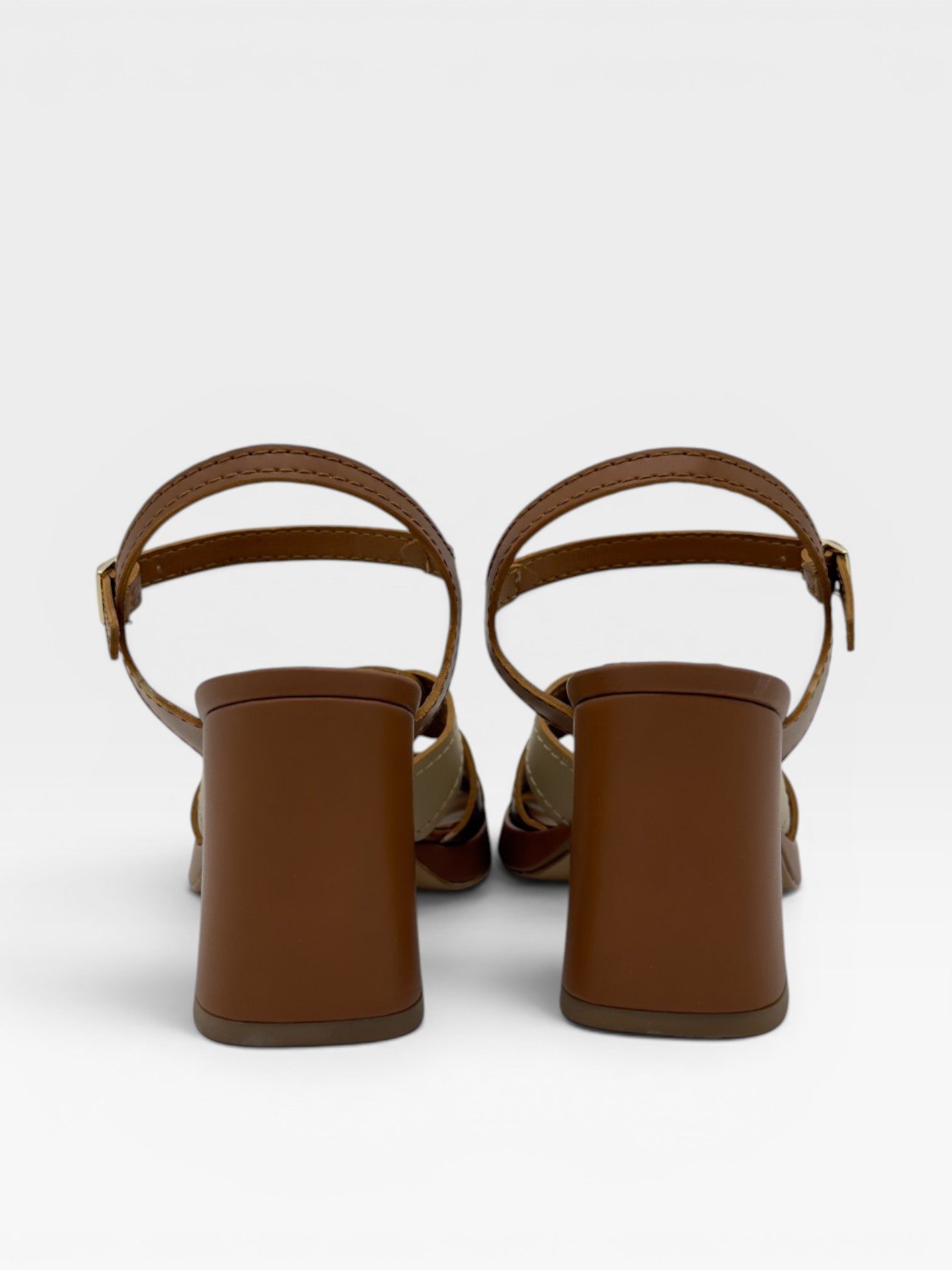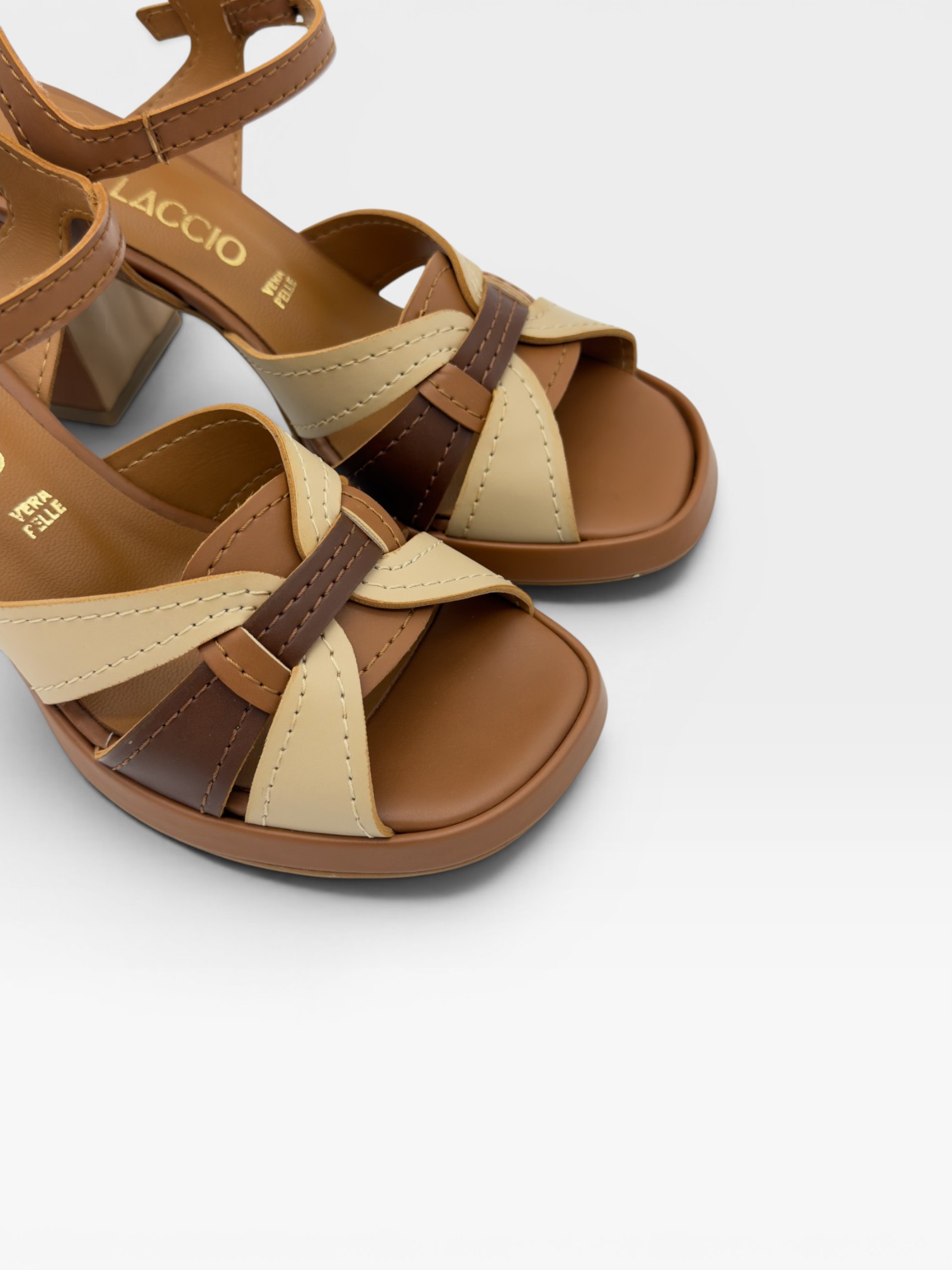 tonalità neutre come cuoio, beige e marrone. Le fasce intrecciate sul davanti creano un effetto