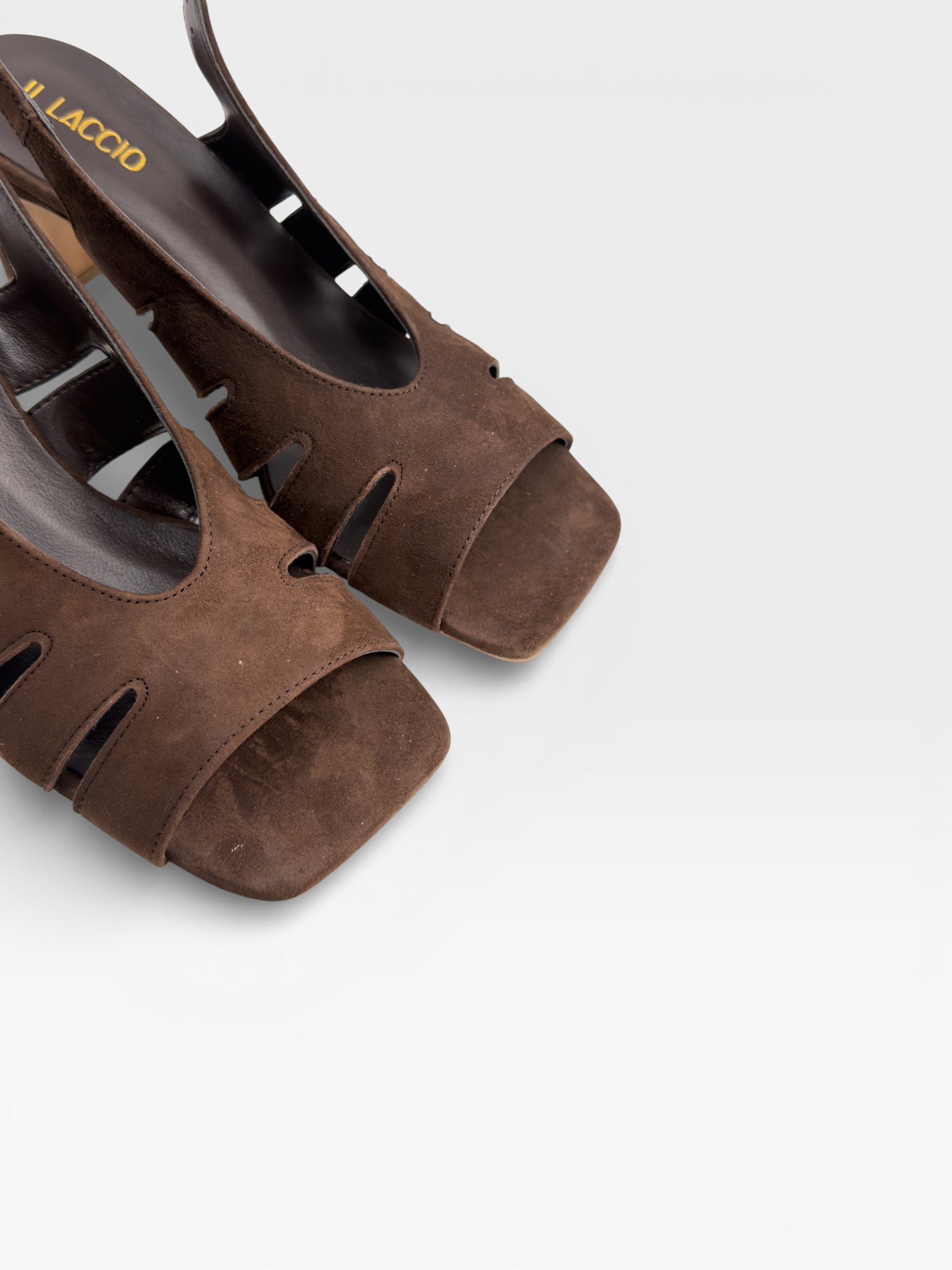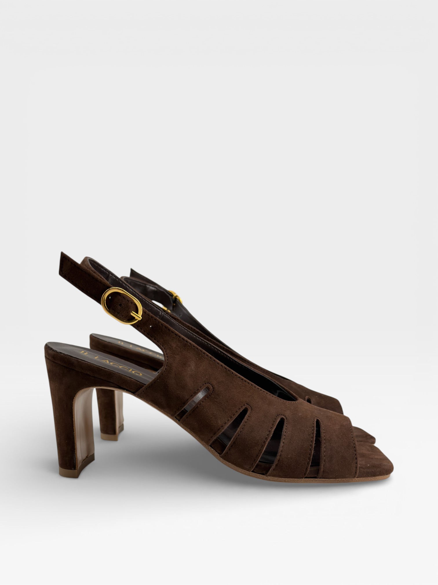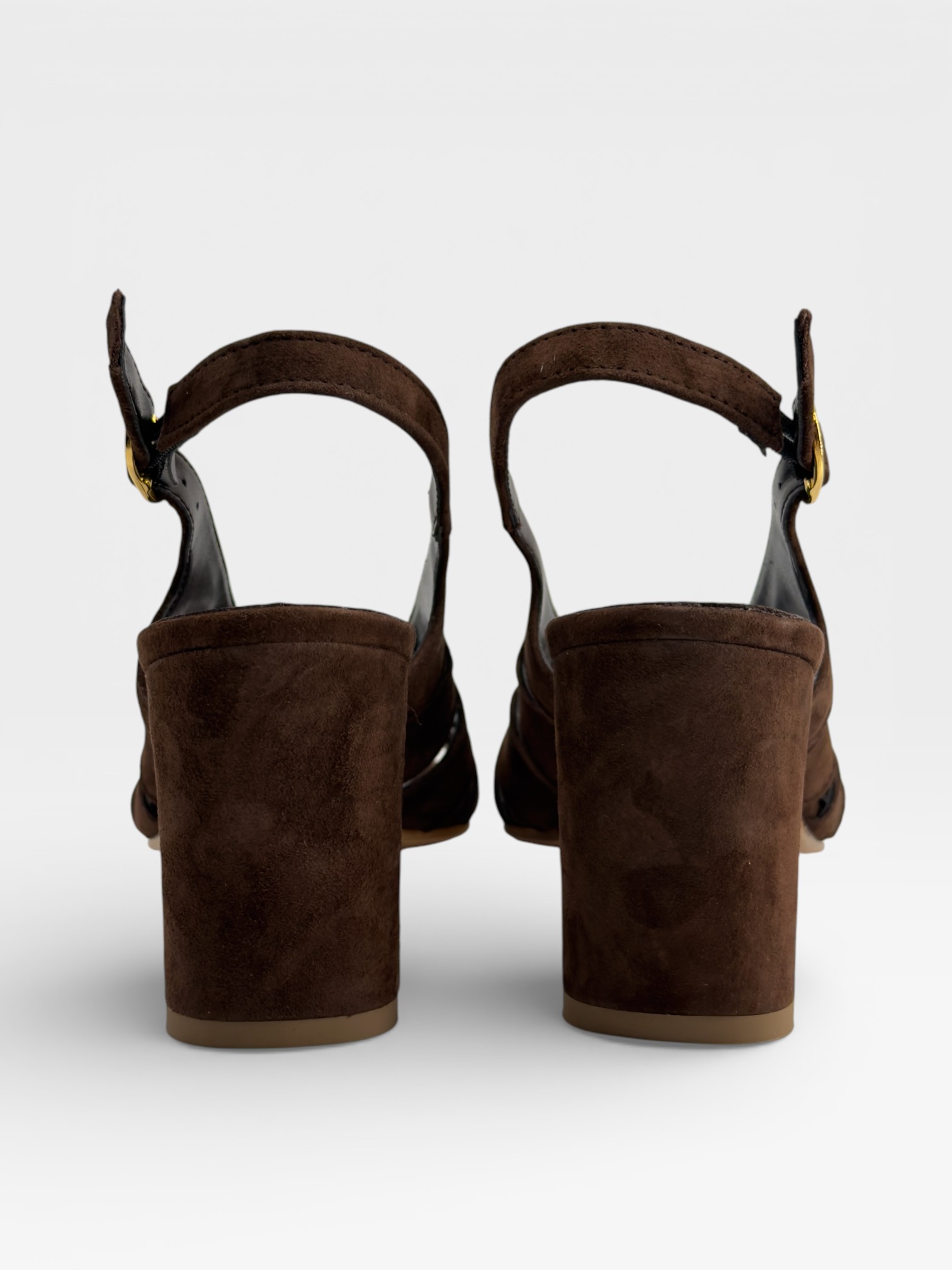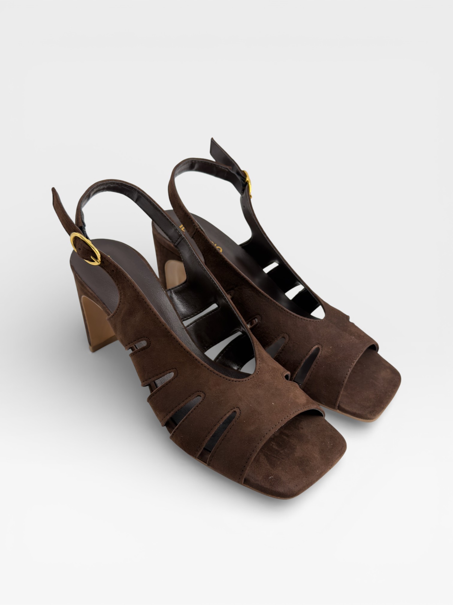 Queste scarpe da donna uniscono carattere e femminilità in un design sofisticato. Realizzate in suede marrone dal finish morbido, presentano una struttura avvolgente con intagli laterali e punta aperta dalla linea squadrata. Il cinturino slingback con fibbia dorata valorizza la caviglia, mentre il tacco alto 7,5cm e strutturato slancia la silhouette. Perfetti come sandali con tacco da indossare nelle occasioni speciali o nelle serate estive, aggiungono personalità a ogni outfit. Scegli queste scarpe eleganti da donna per completare il tuo look con un tocco deciso e raffinato.