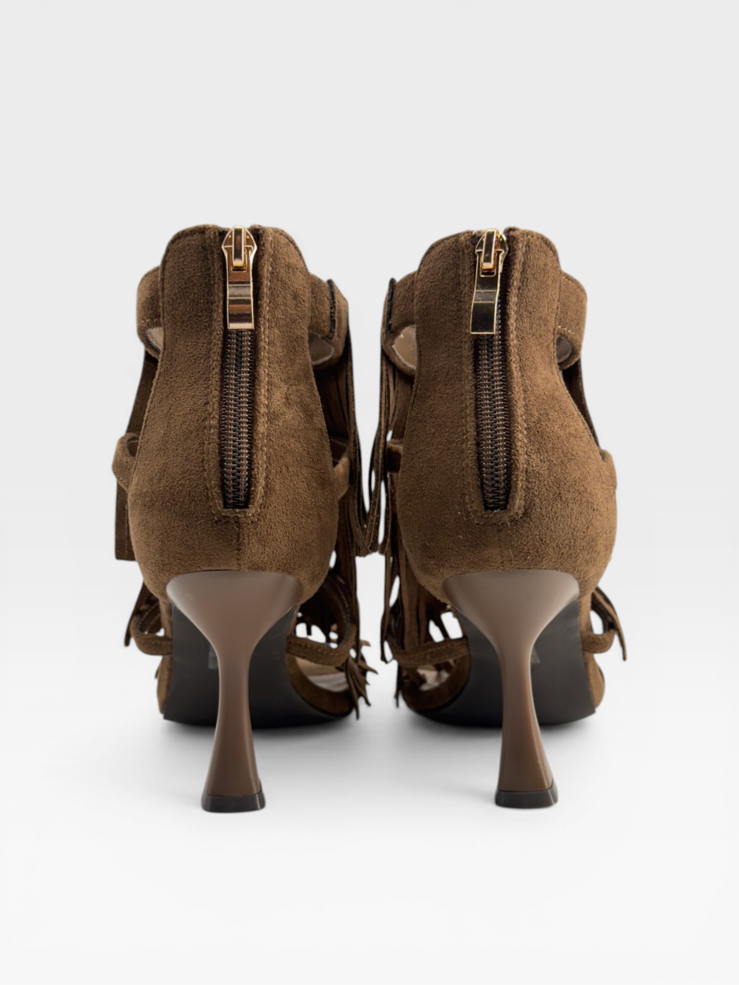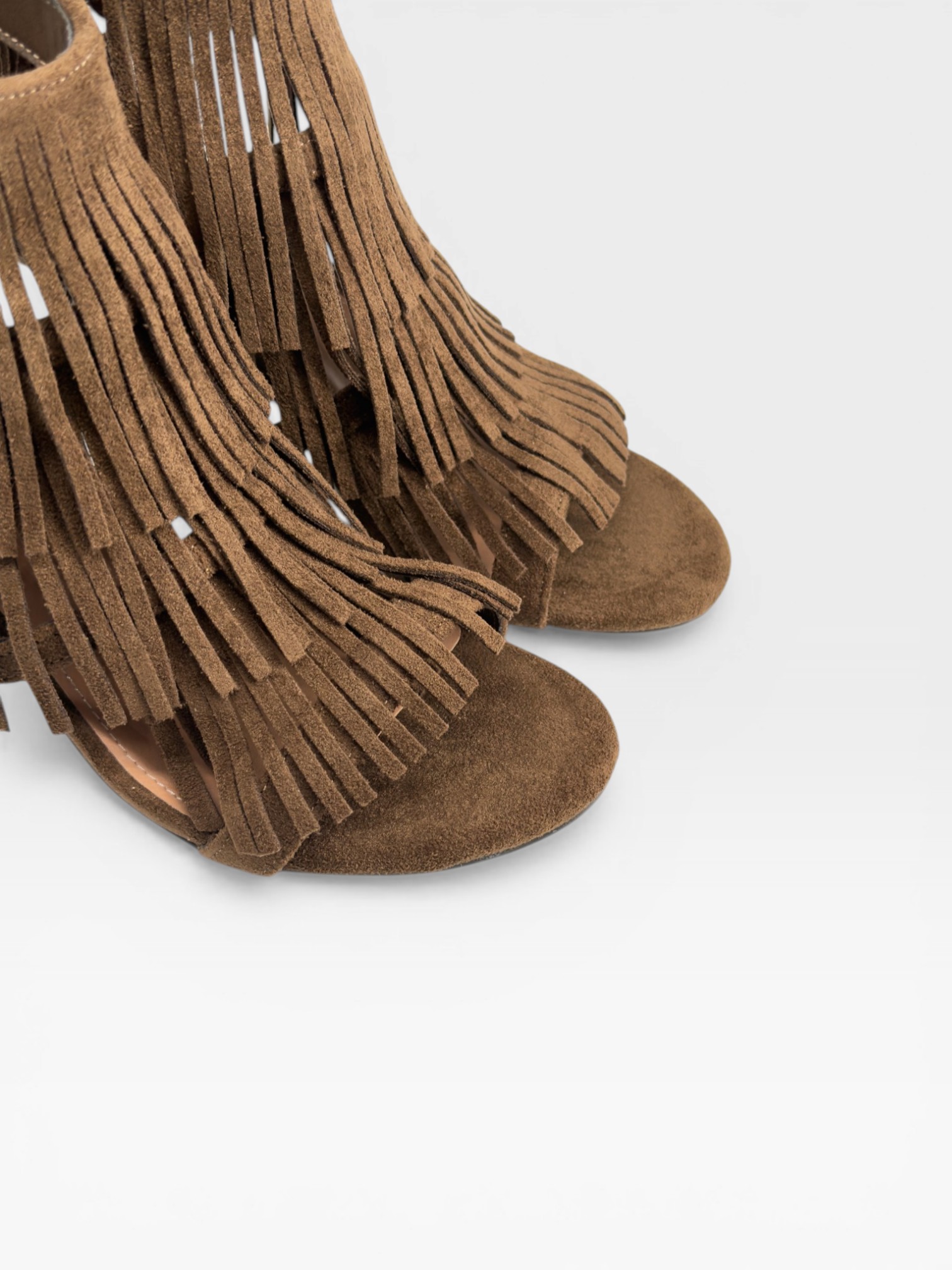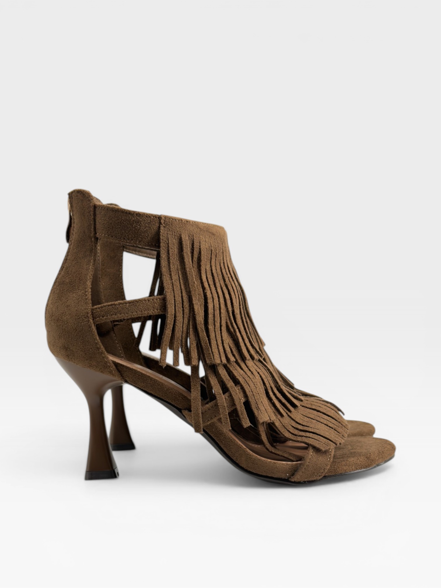 Decise e sofisticate, queste scarpe da donna stile sandalo si distinguono per la tomaia in suede marrone arricchita da lunghe frange fluide che donano movimento ad ogni passo. Il design open toe con cinturino alla caviglia e chiusura posteriore valorizza la silhouette, mentre il tacco 6cm sagomato aggiunge slancio ed eleganza. Perfette come sandali con tacco per serate estive o look boho-chic ricercati.