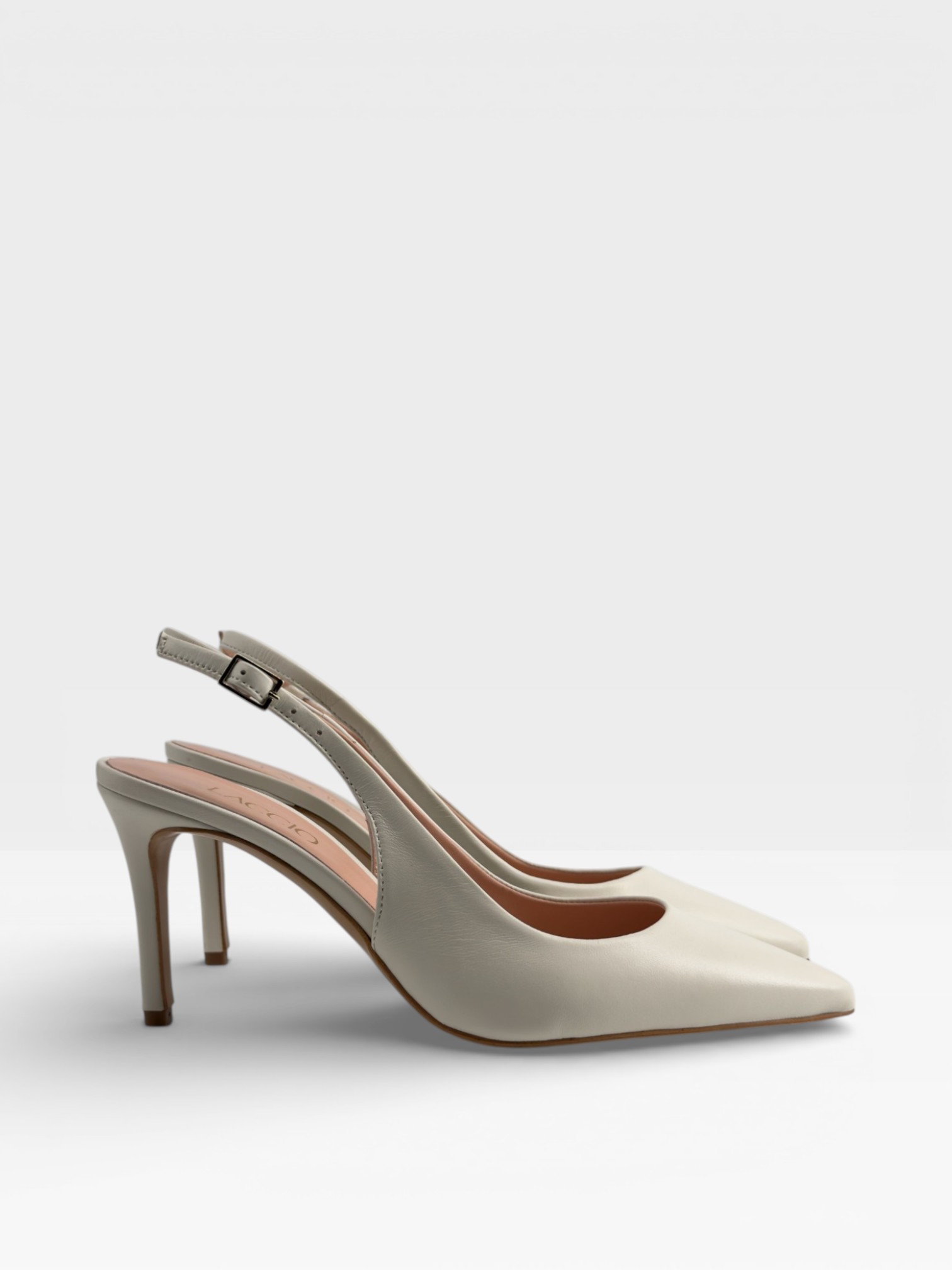 Essenziali e sofisticate, queste scarpe da donna slingback valorizzano la silhouette con una linea pulita e punta affusolata. Realizzate in pelle liscia color bianco, presentano cinturino posteriore regolabile con fibbia argento che assicura una calzata elegante e femminile. Il tacco di 8 cm slancia la figura con armonia, rendendole perfette come décolleté slingback per l'ufficio, cerimonie o look serali raffinati. Ideali con tailleur, abiti midi o pantaloni sartoriali, sono un must-have versatile e intramontabile. Sceglile per un'eleganza minimal e contemporanea.
