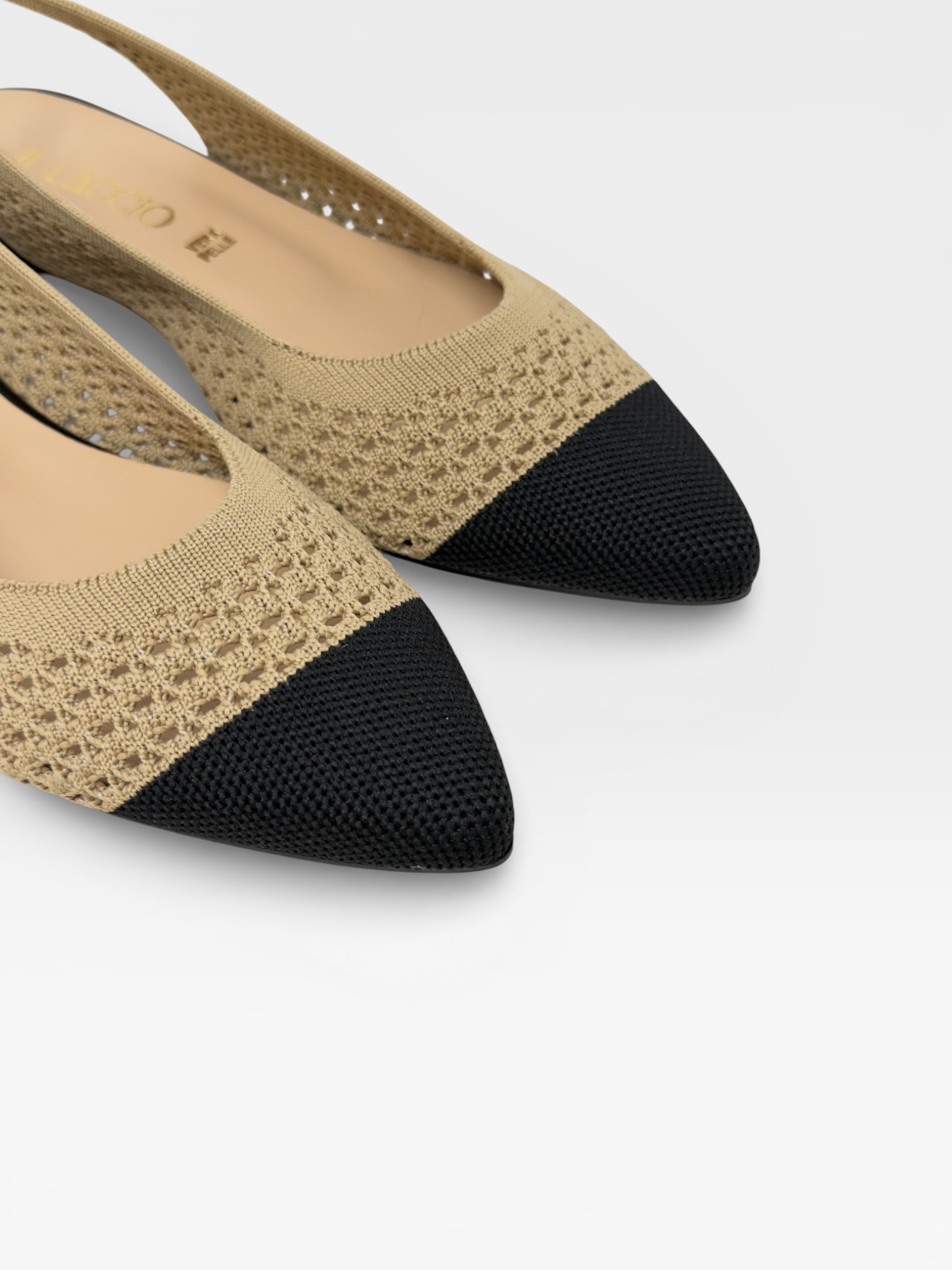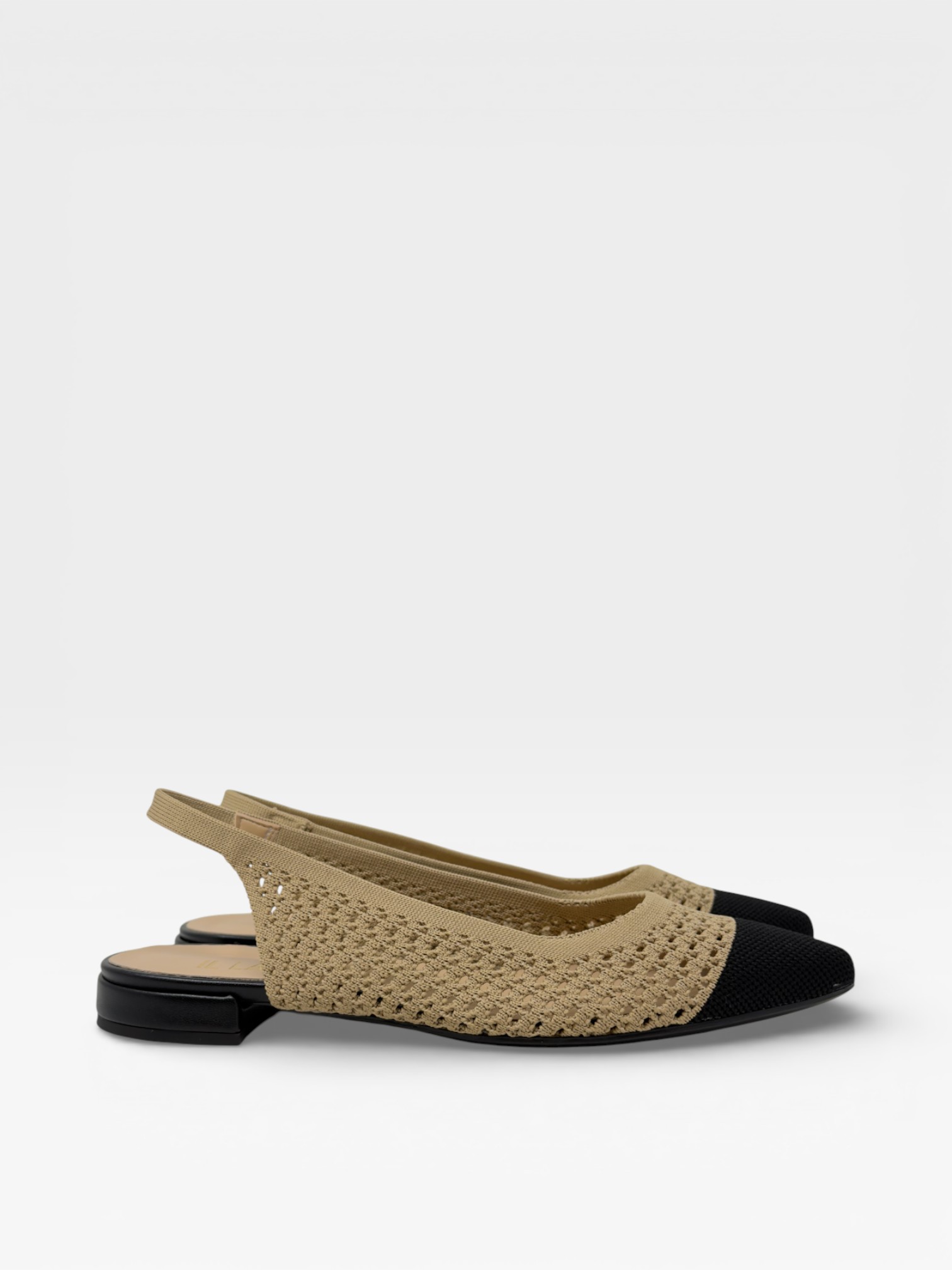 Eleganti e versatili, queste scarpe da donna slingback uniscono stile contemporaneo e comfort. Il design in maglia traforata beige avvolge il piede con leggerezza, mentre la punta a contrasto nera aggiunge un tocco raffinato e chic. Il cinturino posteriore aperto e il tacco basso le rendono perfette come scarpe eleganti donna da giorno, ideali per ufficio, tempo libero o occasioni casual chic. Femminili e facili da abbinare, completano ogni look con discreta ricercatezza. Scopri il modello e lasciati conquistare dal suo stile senza tempo.