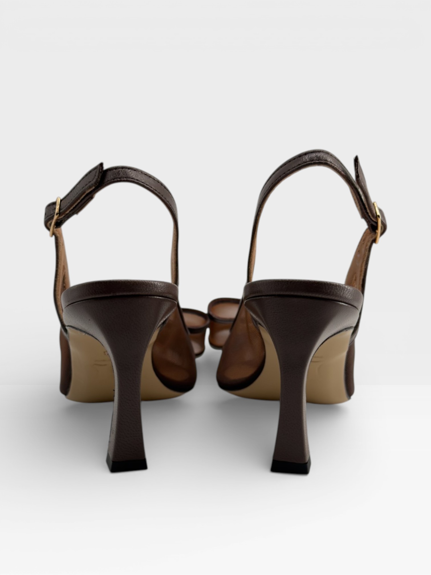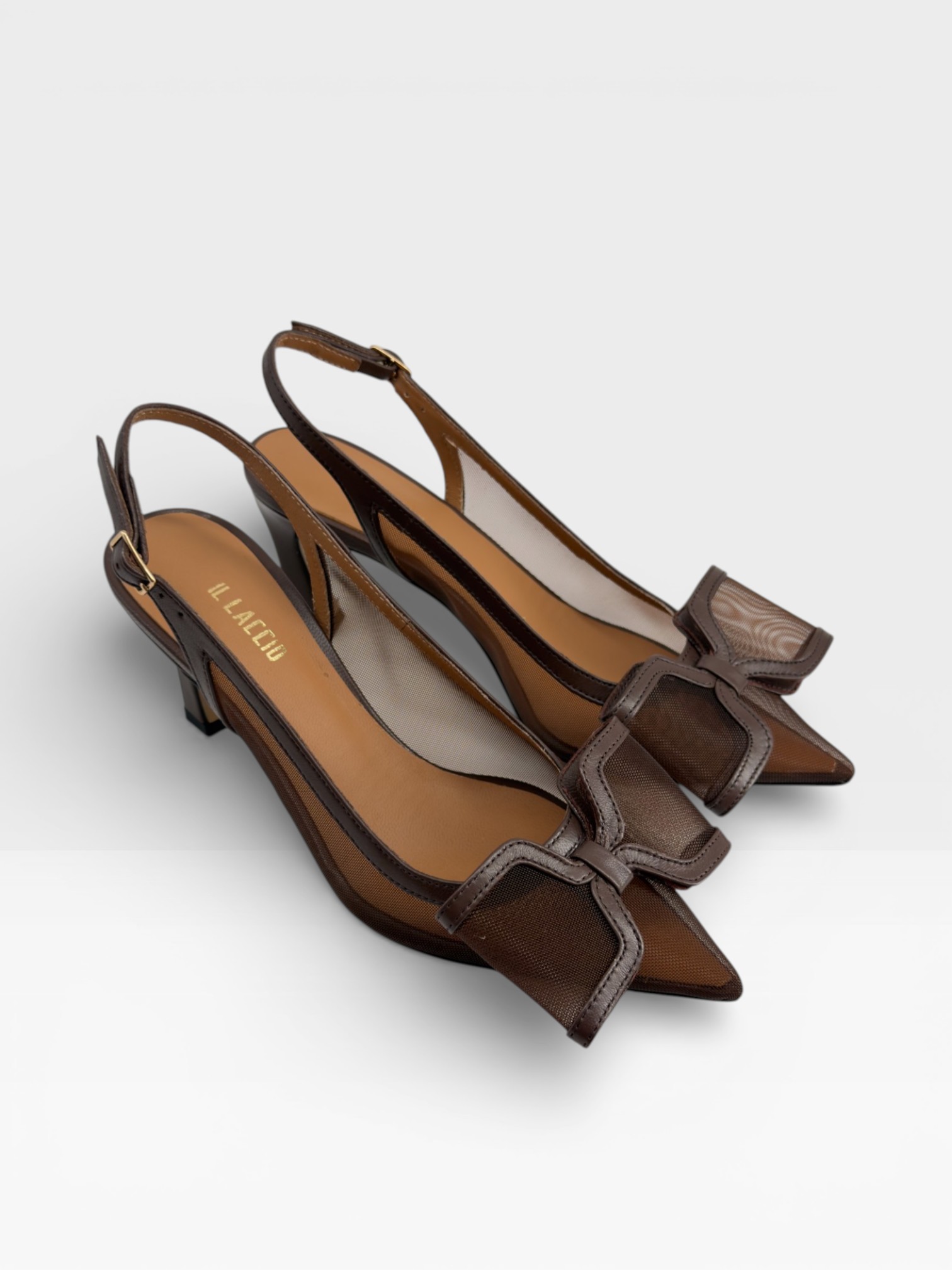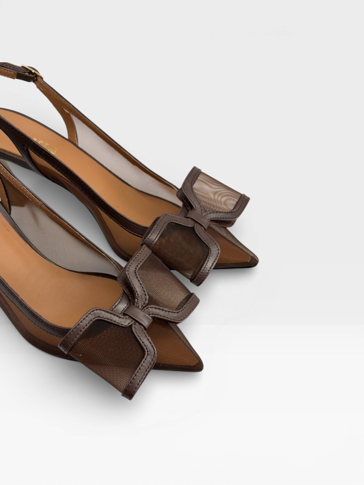 Eleganti e raffinate, queste scarpe da donna slingback uniscono trasparenze leggere e dettagli strutturati. La tomaia in mesh marrone crea un sofisticato gioco vedo-non-vedo, valorizzato dai profili tono su tono e dal fiocco frontale che incornicia la punta affusolata. Il cinturino posteriore con fibbia completa la linea femminile, mentre il tacco di 8 cm slancia la silhouette con decisione. Perfette come décolleté slingback per eventi, cerimonie o look serali ricercati. Sceglile per un'eleganza moderna e distintiva.