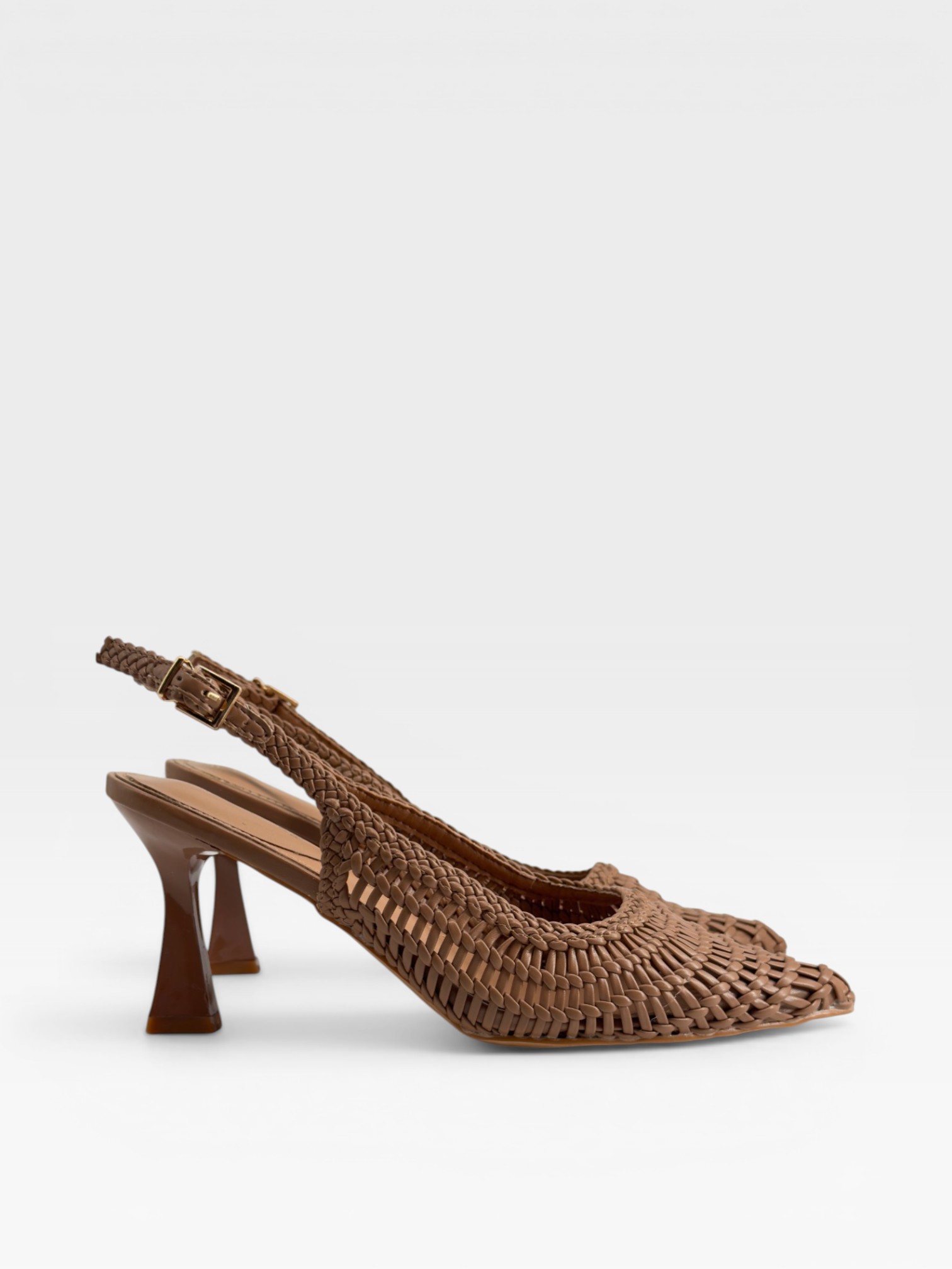 Eleganti scarpe da donna modello slingback, con raffinata lavorazione intrecciata color cuoio che dona texture e leggerezza. La punta affusolata slancia la silhouette, mentre il cinturino posteriore con fibbia assicura una calzata stabile. Il tacco 8cm sagomato aggiunge comfort ed eleganza, perfetto per l'uso quotidiano. Ideali come décolleté estive o scarpe con tacco versatili per look da ufficio e tempo libero.