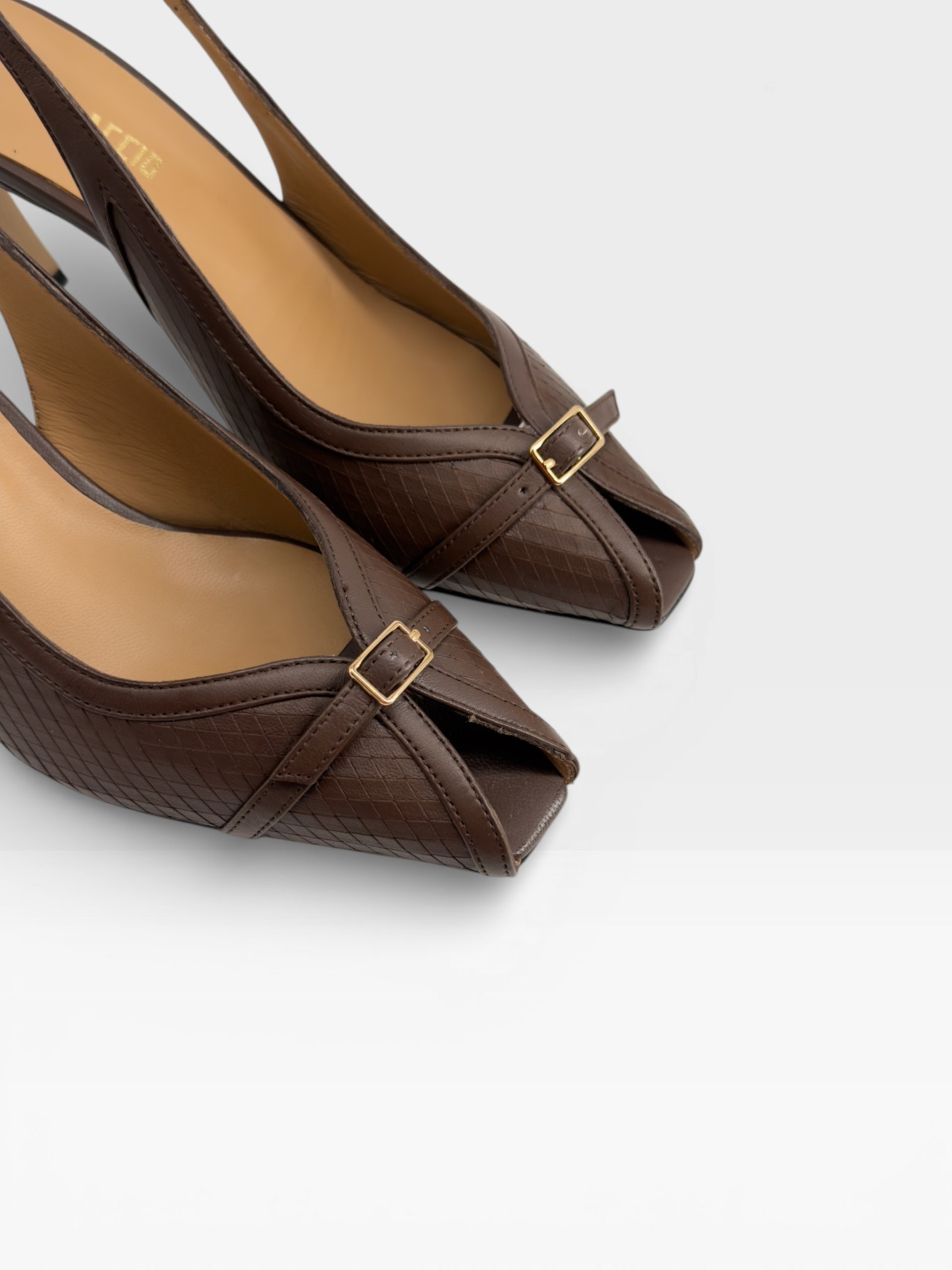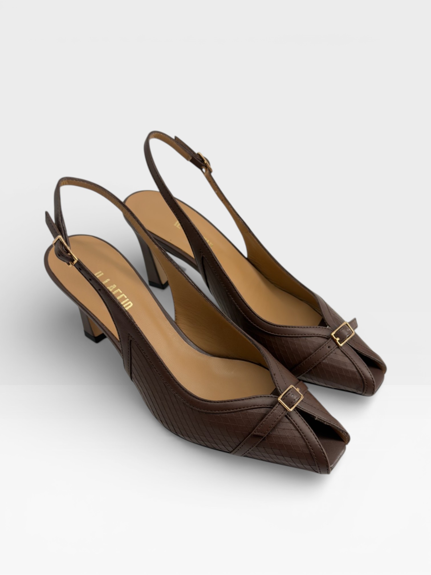 Raffinate e strutturate, queste scarpe da donna slingback valorizzano la silhouette con punta affusolata e design avvolgente. Realizzate in pelle marrone con delicata lavorazione geometrica, presentano cinturini incrociati sul davanti con fibbia dorata che aggiunge un dettaglio ricercato. Il cinturino posteriore completa la linea femminile, mentre il tacco di 7,5 cm slancia la figura con eleganza e stabilità. Perfette come décolleté slingback per l'ufficio o occasioni speciali, si abbinano con facilità ad abiti midi e pantaloni sartoriali. Sceglile per uno stile sofisticato e contemporaneo.