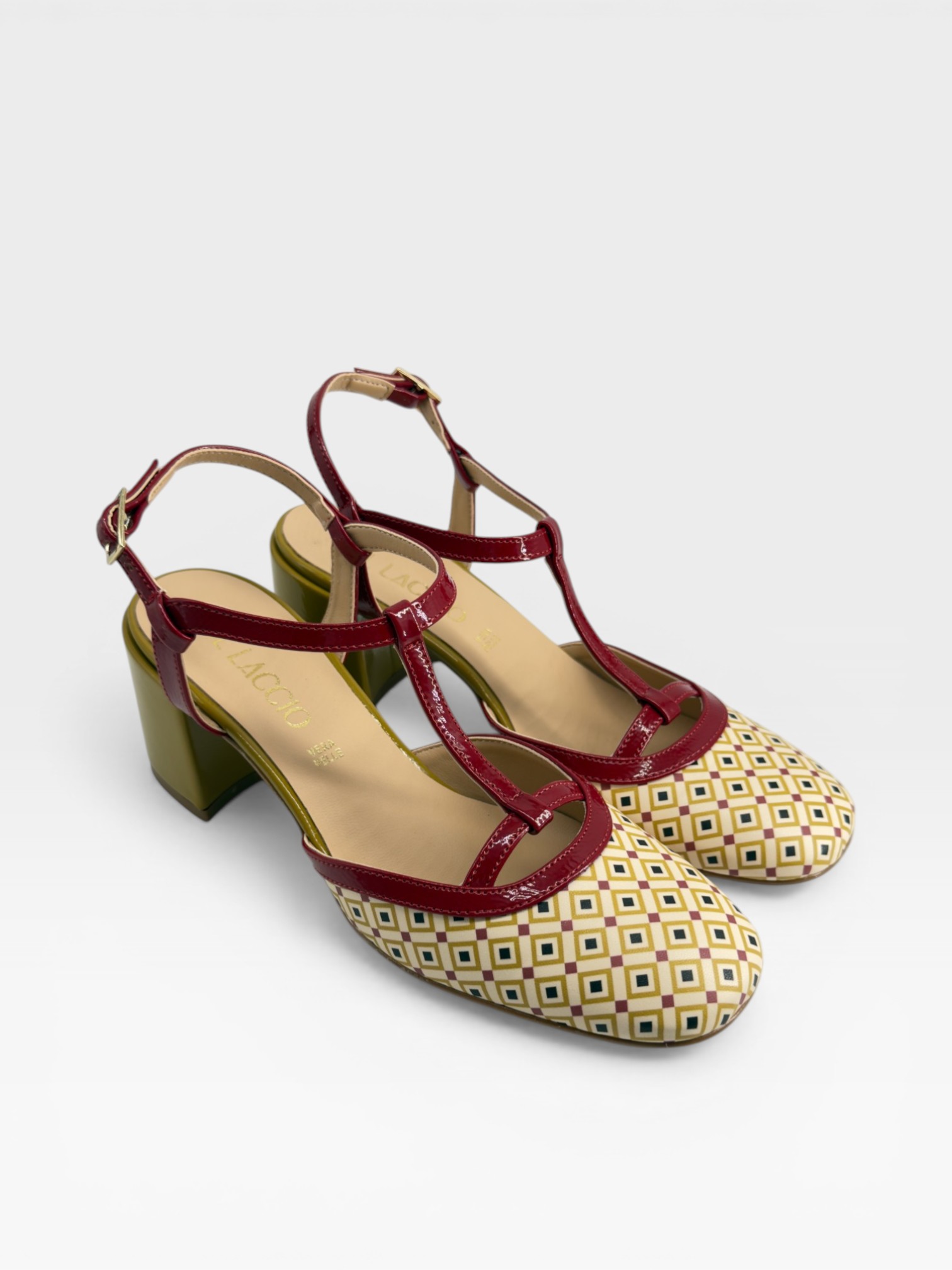 Raffinate scarpe da donna dal design rétro, con tomaia beige decorata da una delicata fantasia geometrica multicolor e cinturini T-bar in vernice rossa. Il tacco 5,5cm strutturato, in tonalità coordinata, assicura comfort e stabilità per tutta la giornata. La punta arrotondata e il cinturino con fibbia valorizzano il piede con eleganza. Perfette come décolleté con tacco per look da giorno o occasioni casual chic.