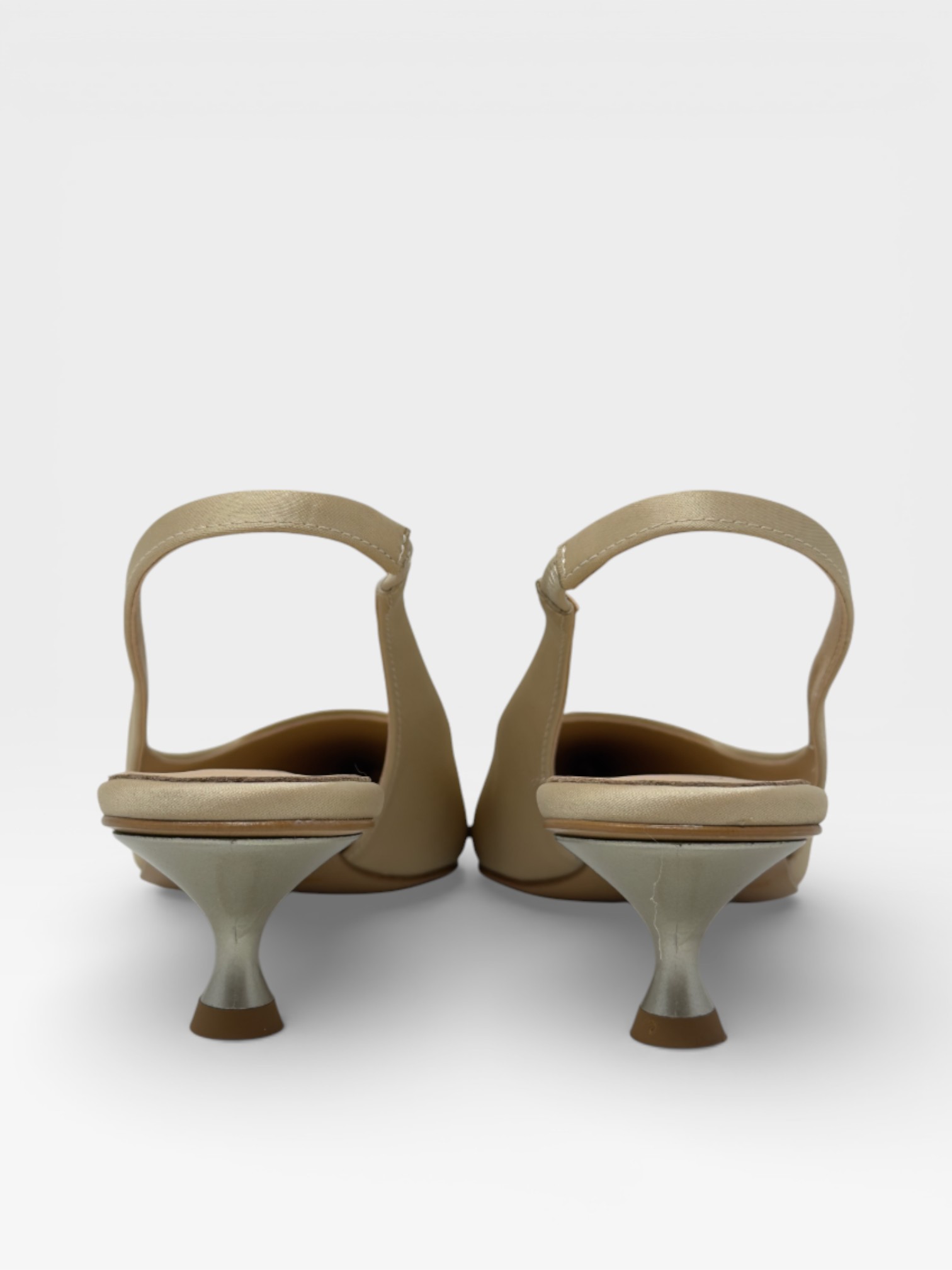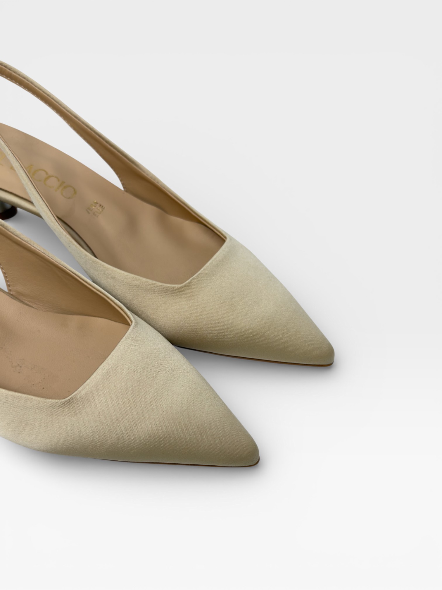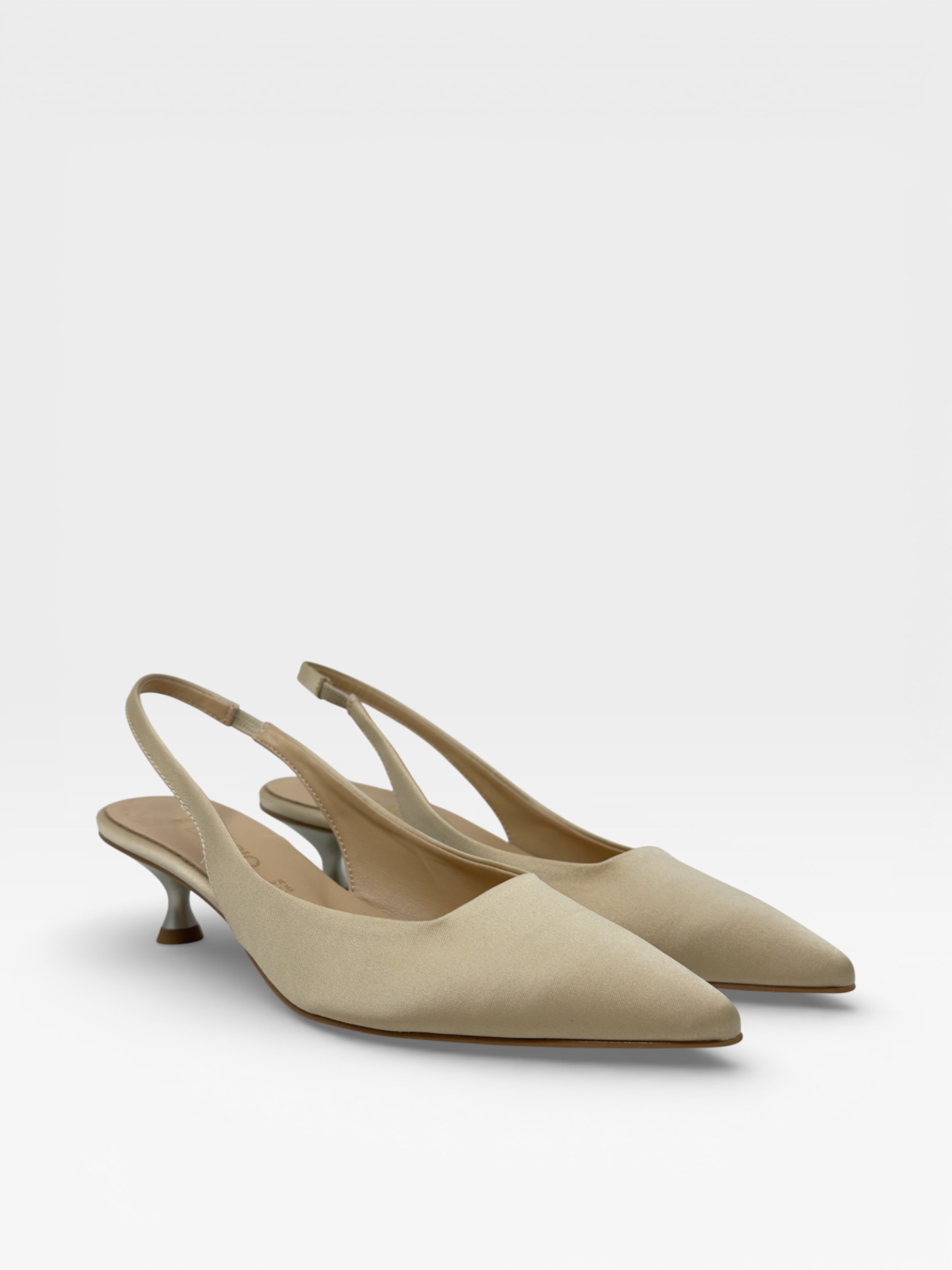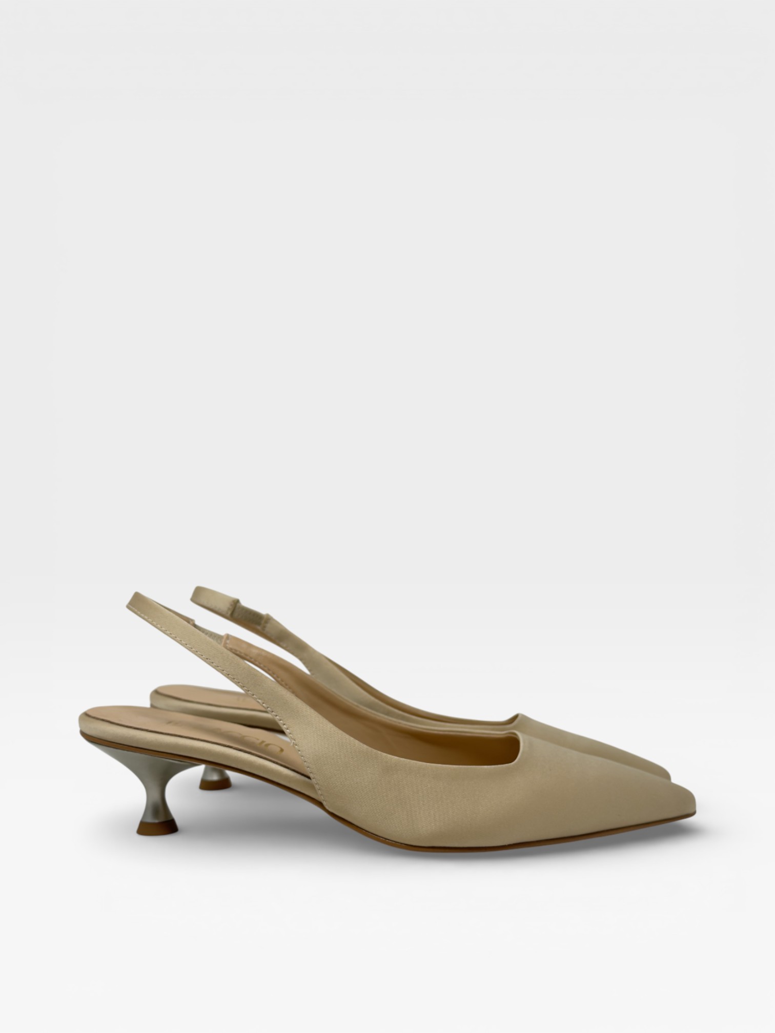 Impreziosisci il tuo stile con la slingback in raso champagne, simbolo di eleganza e raffinatezza, Made in Italy!
