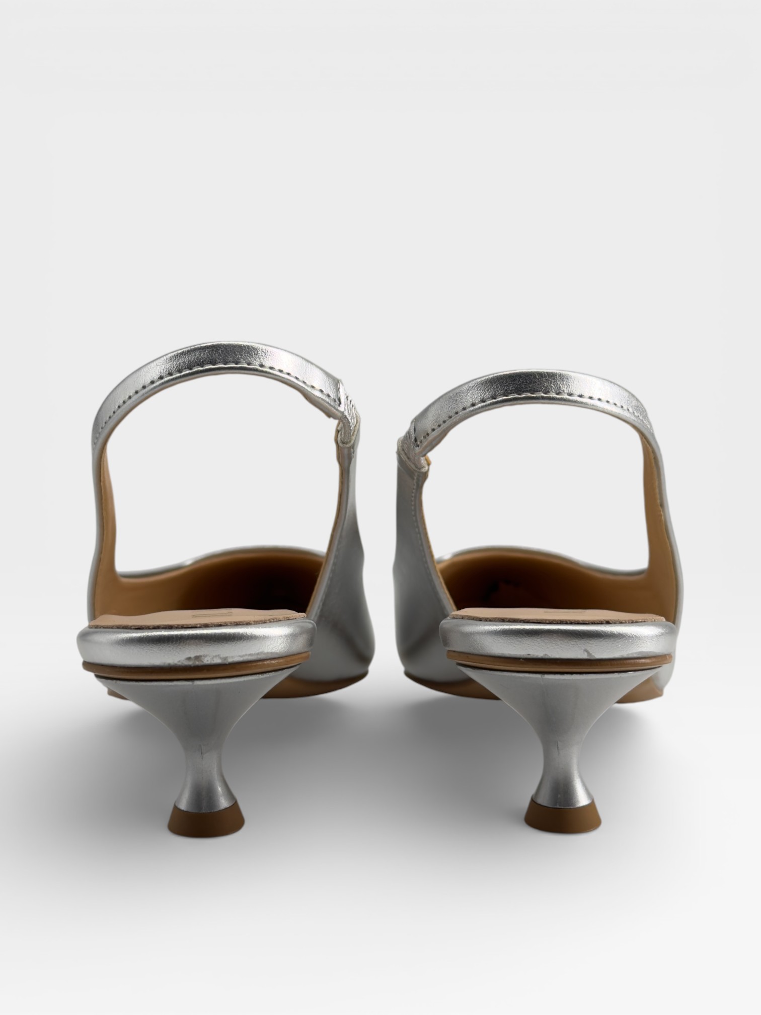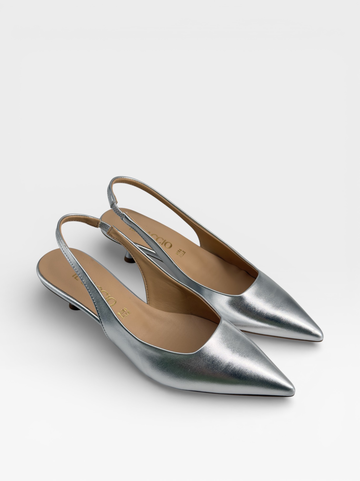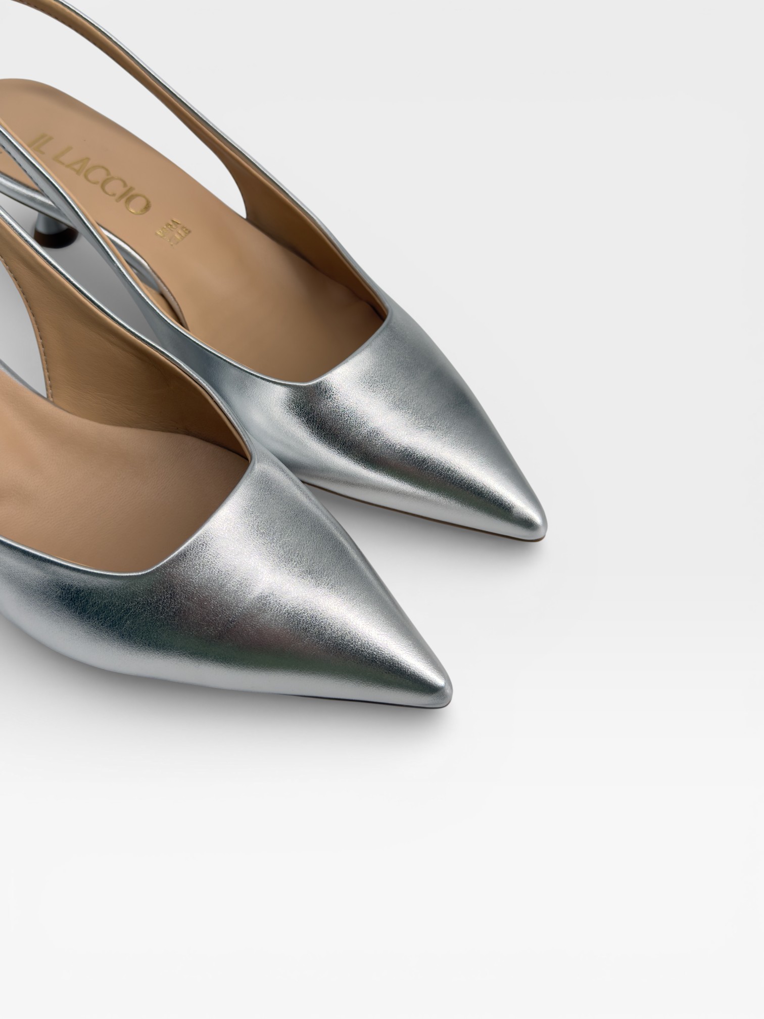 Brilla con la slingback in pelle laminata argento, una scelta di stile audace e sofisticato Made in Italy!
