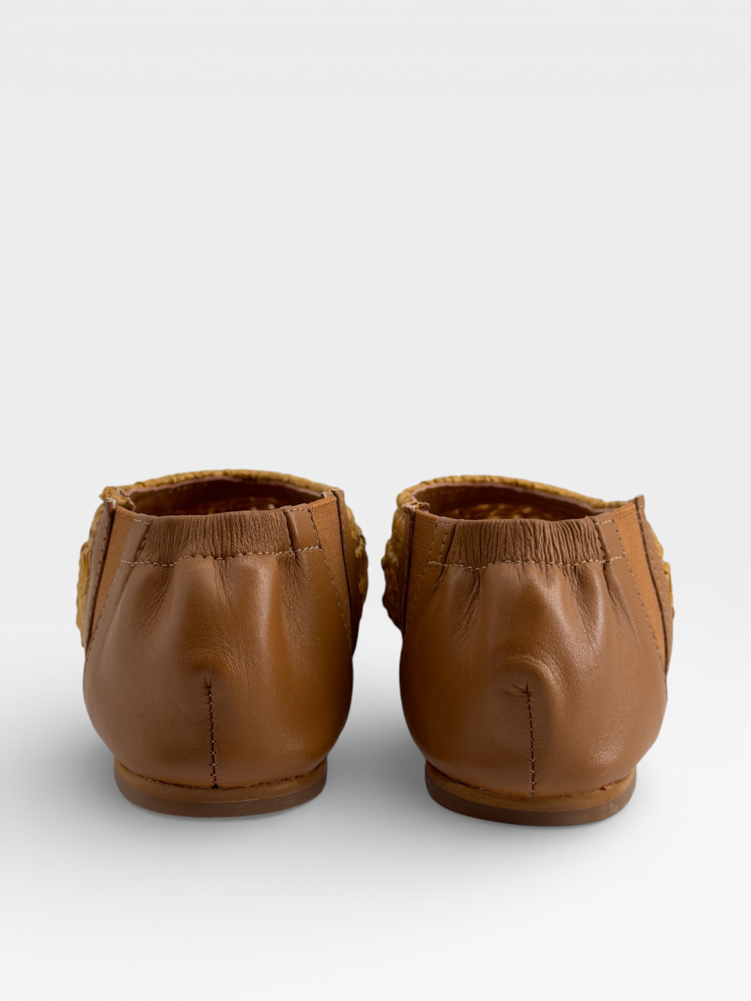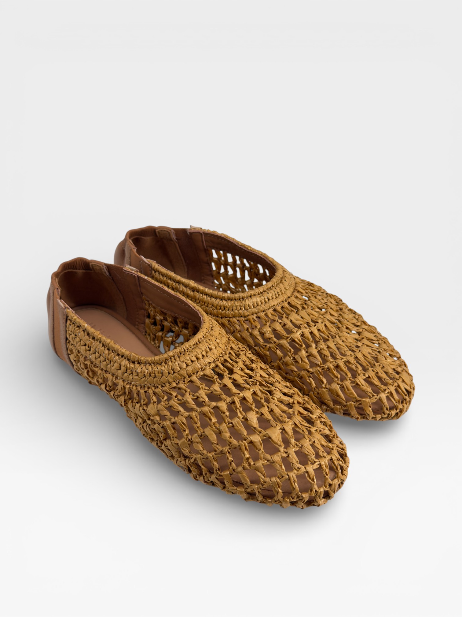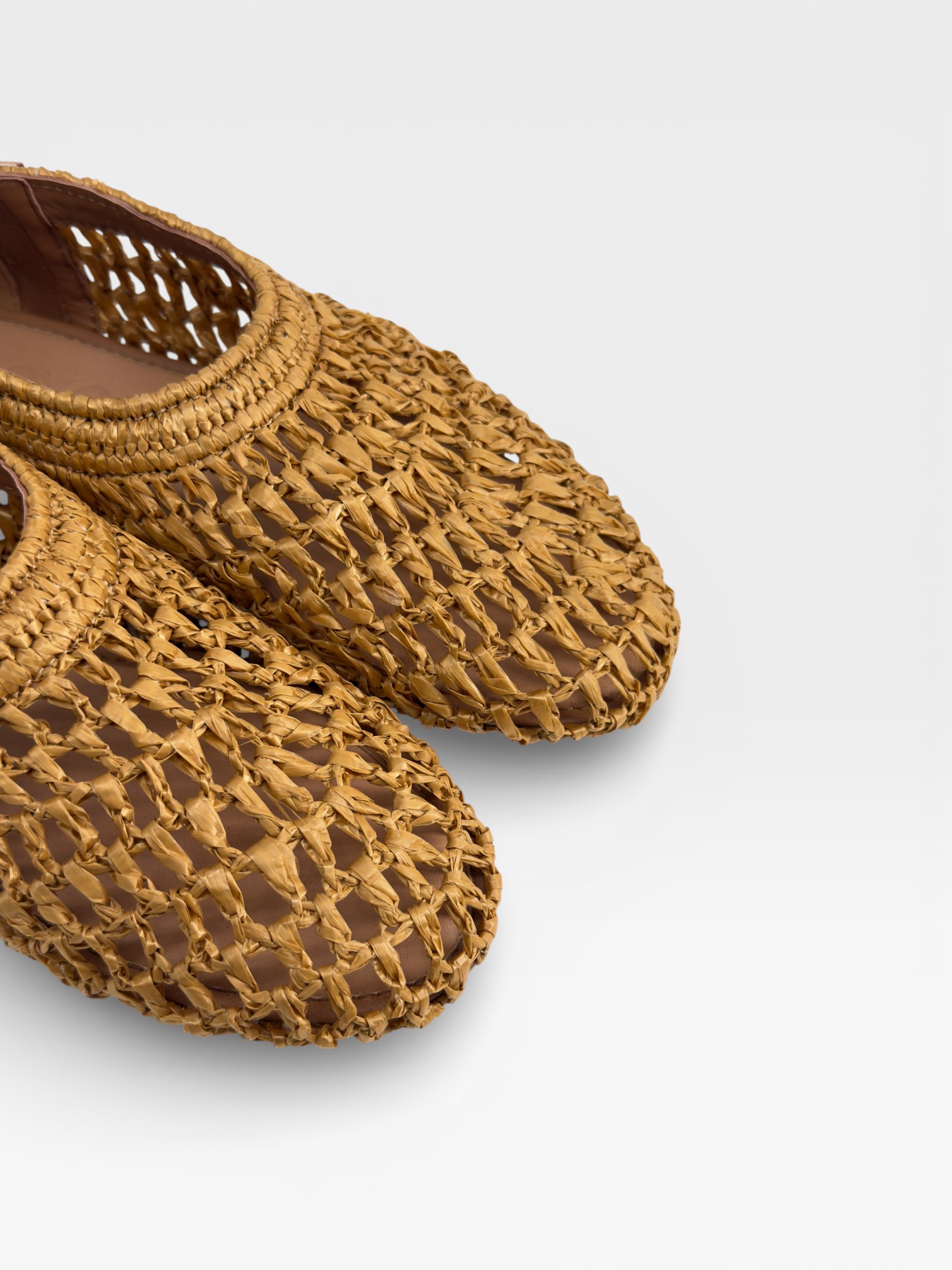 Queste scarpe da donna esprimono leggerezza e fascino naturale grazie alla lavorazione intrecciata in tonalità miele. La silhouette arrotondata e la struttura flat garantiscono comfort quotidiano, mentre il design traforato dona traspirabilità e un'eleganza discreta. Perfette come ballerine estive da donna, completano con stile look casual chic, abiti leggeri o outfit minimal. Il gioco di texture valorizza ogni passo con un tocco artigianale e raffinato. Scegli queste scarpe intrecciate per arricchire il tuo guardaroba con un modello versatile e sofisticato.