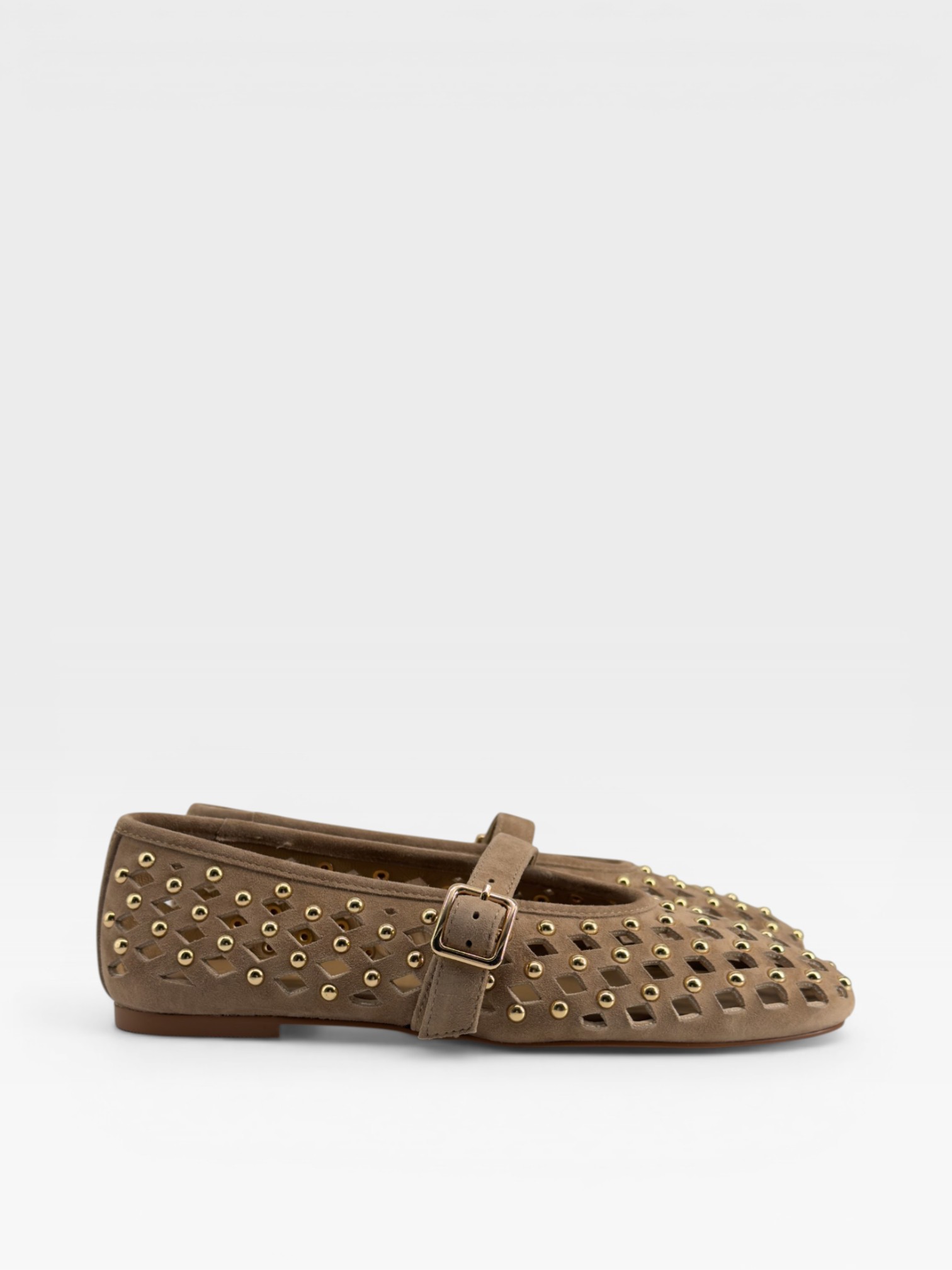 Raffinate scarpe da donna modello ballerine, con tomaia traforata beige arricchita da borchie oro che donano carattere e luminosità. Il cinturino Mary Jane con fibbia valorizza il piede e assicura una calzata stabile, mentre il design leggero garantisce comfort quotidiano. Perfette come ballerine eleganti o scarpe basse chic, ideali per look femminili dal giorno alla sera.