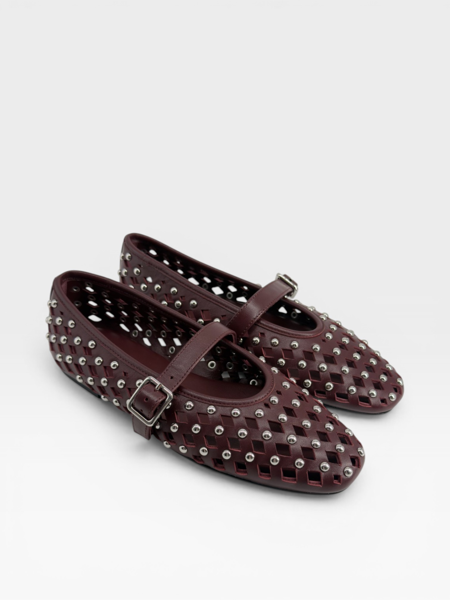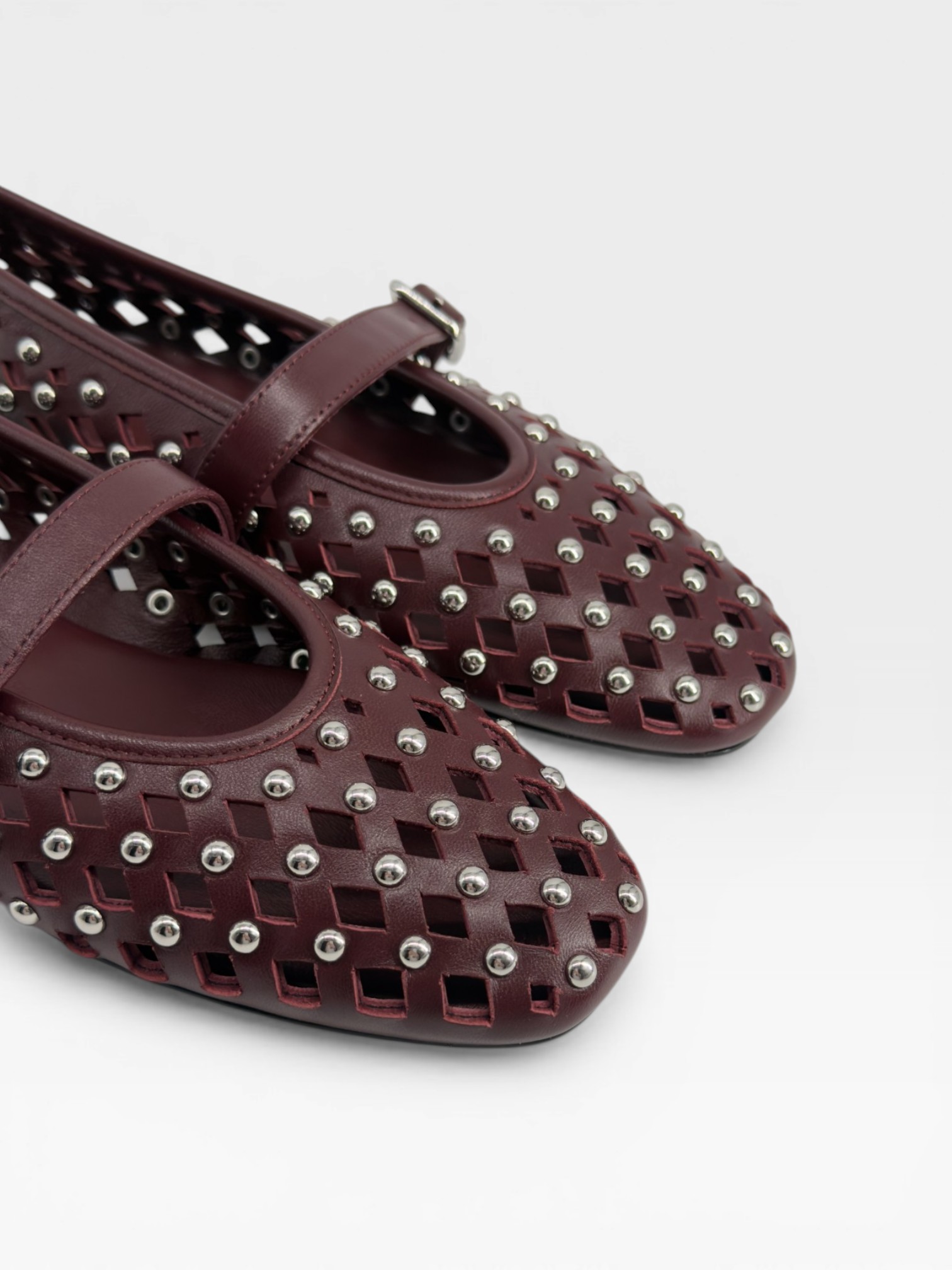 Scarpe da donna ballerine traforate bordeaux con borchie argento