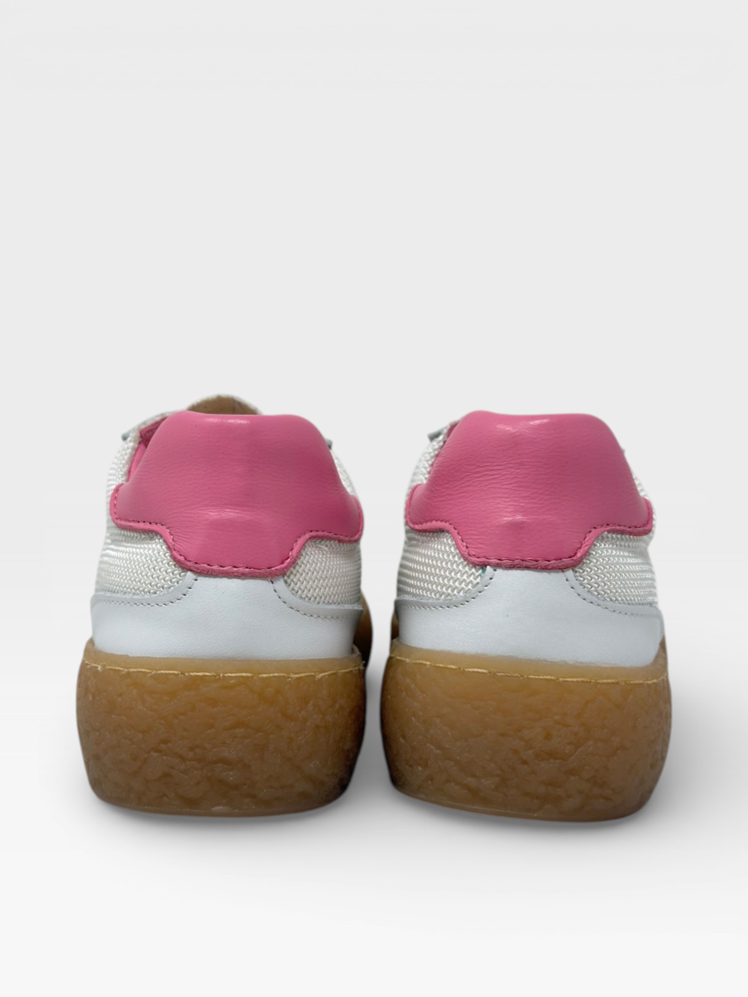 Queste scarpe da donna stile sneakers casual uniscono comfort e carattere in un design sportivo e contemporaneo. La tomaia combina inserti bianchi con dettagli rosa vivace, come le bande laterali e la fodera interna, creando un contrasto fresco e dinamico. I lacci coordinati e la suola color naturale completano il look, rendendo queste sneakers da donna perfette per outfit quotidiani, tempo libero e look urban.